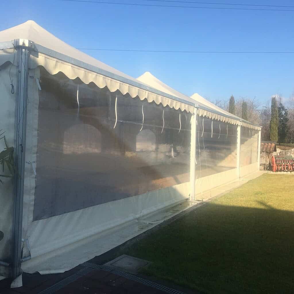 - Protezione contro le intemperie. Le tende trasparenti hanno un design resistente agli agenti atmosferici e impediscono al vento e alla pioggia di rovinare il tuo evento. Il tessuto vinilico che ricopre queste tende è robusto e impermeabile.